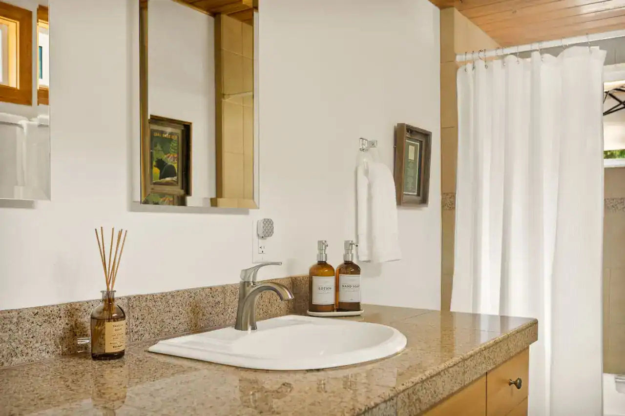 Master Bedroom: Venture into the master bedroom to find a king-sized bed adorned with luxurious new bedding. This sleep sanctuary offers an intimate connection with nature, providing captivating views of the National Forest that will leave you spellbound. Spend time here streaming one of your favorite shows on the new Smart TV or catch up on some work at our new desk. Note the newly installed A/C/Heating unit to keep you comfortable during all seasons.