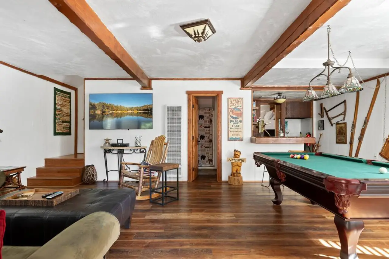 Game Room : There is a wet bar, small beverage refrigerator, large sectional couch, pool table and smart TV located in the downstairs game room. There is room for an air mattress, along with couch sleeping. The air bed is located in the bunk room chest. Many table games are located in the cabinet behind the bar that include backgammon, cribbige, chess and many others.