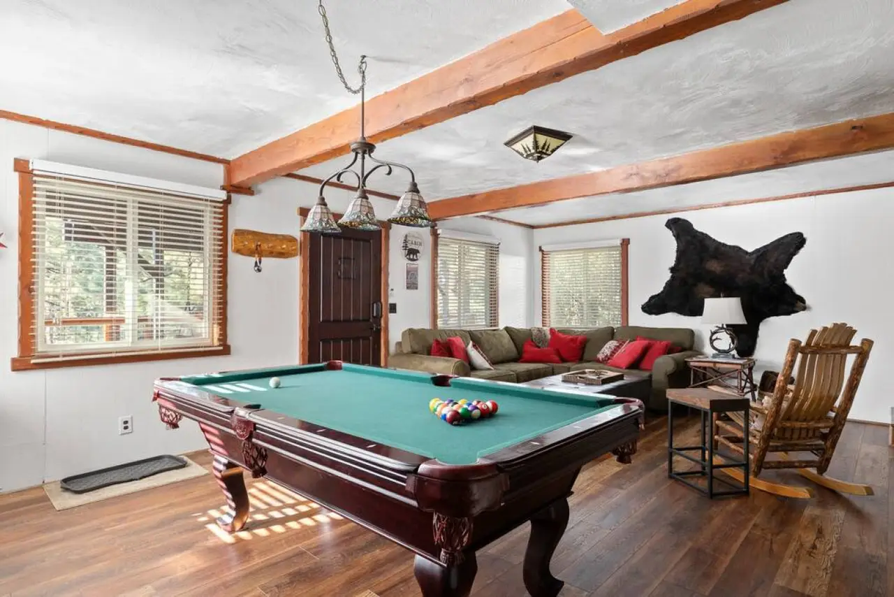 Unique feature about our cabin is that there is two living spaces…upstairs is the kitchen, TV, deck area that can be used by some in your group, while the downstairs has a separate TV, pool table and bar and can be used by another group wanting to stay up later, more active (kids playing). Many times the adults are upstairs relaxing, while the younger ones are downstairs having fun!